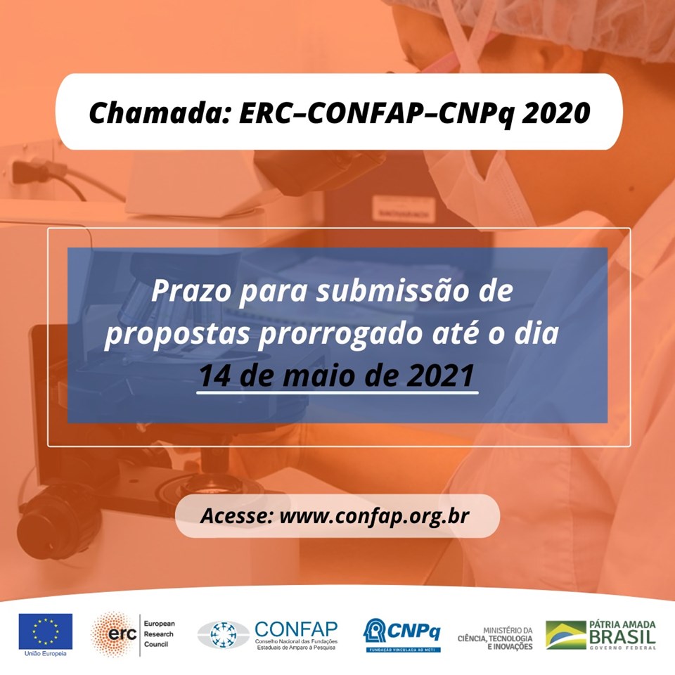 O Conselho Nacional das Fundações Estaduais de Amparo à Pesquisa (Confap), e o Conselho Nacional de Desenvolvimento Científico e Tecnológico (CNPq), prorrogaram para o dia 14 de maio de 2021, o prazo para submissão de propostas da chamada ERC-Confap-CNPq 2020.