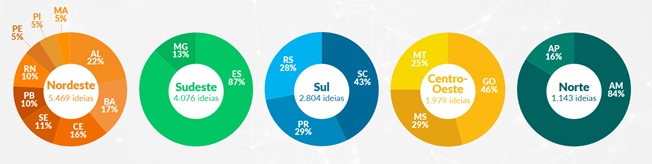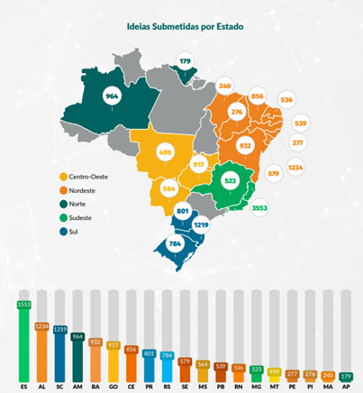 No gráfico comparativo do desempenho dos estados brasileiros divididos por região, o Estado segue com destaque. Na região sudeste apenas os estados de Minas Gerais e Espírito Santo participaram do Programa, sendo que o Espírito Santo foi responsável por 87% das ideias submetidas ao edital.