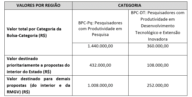Estimulando a interiorização das atividades de pesquisa, desenvolvimento tecnológico, de ações de inovação e extensão, 30% dos recursos financeiros serão destinados, prioritariamente, a propostas de pesquisadores vinculados a instituições localizadas fora da Região Metropolitana da Grande Vitória, conforme tabela abaixo.