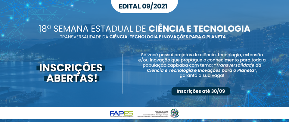 A Fundação de Amparo à Pesquisa e Inovação do Espírito Santo (Fapes) segue o cronograma de trabalho da Jornada Capixaba de Ciência e Inovação e anuncia que está aberta a seleção de projetos de ciência, tecnologia, extensão e/ou inovação, por meio do Edital Nº 009/2021, visando à difusão do conhecimento para toda a população capixaba com tema: “Transversalidade da Ciência e Tecnologia e Inovações para o Planeta. Os interessados em participar devem entregar propostas até 30 de setembro.