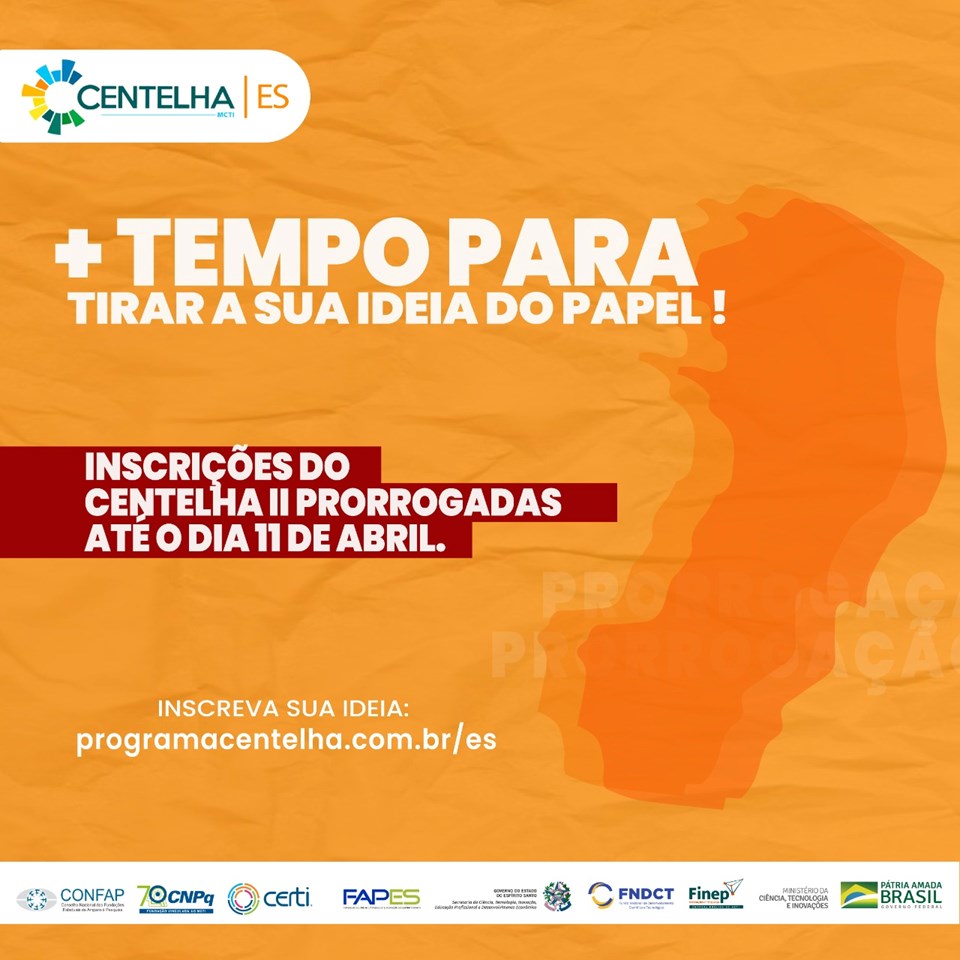 As boas ideias de projetos de negócios inovadores ganharam mais um prazo para serem apresentadas na 2ª edição do Centelha ES. A Fundação de Amparo à Pesquisa e Inovação do Espírito Santo (Fapes) prorrogou o prazo limite de inscrições até o próximo dia 11 de abril. O programa é mais uma ação do Governo do Estado para impulsionar o empreendedorismo inovador do Espírito Santo. Na primeira edição do Centelha, em 2019, o Espírito Santo foi recordista nacional com 3556 inscritos.