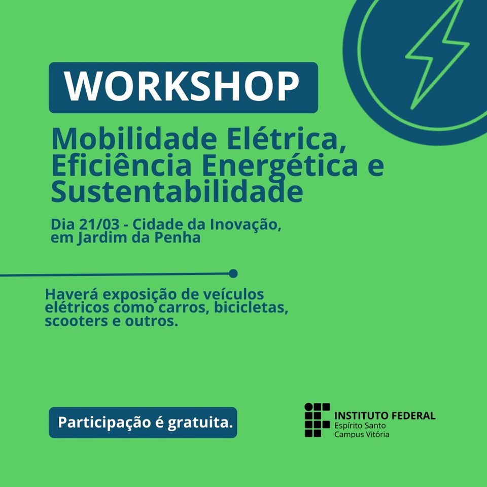 Vem aí o Workshop de Mobilidade Elétrica, Eficiência Energética e Sustentabilidade promovido pelo Instituto Federal de Educação, Ciência e Tecnologia do Espírito Santo (Ifes). No evento, será realizado o lançamento do livro “Mobilidade Elétrica no Espírito Santo: Um Projeto de Vanguarda”, realizado com o apoio da Fundação de Amparo à Pesquisa e Inovação do Espírito Santo (Fapes). O evento vai ser realizado nesta quinta-feira (21), das 13h30 às 21h, na Cidade da Inovação, em Jardim da Penha, Vitória. A participação é gratuita.