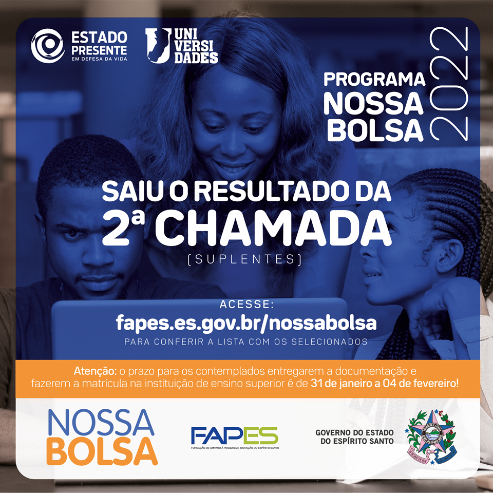 Os inscritos no processo seletivo do Nossa Bolsa 2022 já podem conferir a lista com o resultado da 2ª chamada do edital. A Fundação de Amparo à Pesquisa e Inovação do Espírito Santo (Fapes) divulgou, nesta sexta-feira (28), o resultado dos suplentes para as bolsas integrais destinadas à graduação. Ao todo, o edital, que é uma parceria da Fapes com a Secretaria da Educação (Sedu), ofertou 1.309 bolsas para a população.
