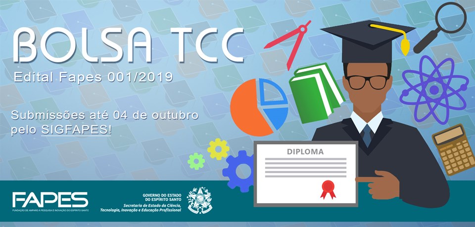 Pela segunda vez, a Fundação de Amparo à Pesquisa e Inovação do Espírito Santo (Fapes) abre inscrições para conceder apoio a trabalhos de conclusão de curso. Trata-se de mais uma chamada do Bolsa TCC (Edital 001/2019), que recebe propostas até 4 de outubro por meio do Sistema de Informação e Gestão (SigFapes). Serão até 370 selecionados para receber uma ajuda de custo de R$ 400 para fazer o trabalho final de graduação com a temática voltada ao empreendedorismo e à inovação.