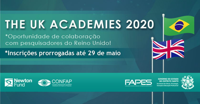 Foi prorrogado para o próximo dia 29 de maio o prazo de submissão de projetos para chamada pública The UK Academies 2019-2020. O objetivo é apoiar investigações científicas feitas em parceria entre pesquisadores capixabas e do Reino Unido, por meio de um acordo entre Governo Britânico com agências brasileiras de fomento à ciência.
