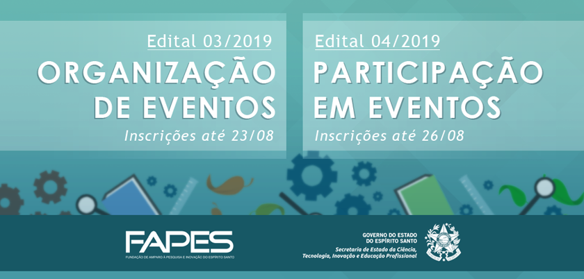 A Fundação de Amparo à Pesquisa e Inovação do Espírito Santo (Fapes) está com inscrições abertas referentes às chamadas públicas para organização de eventos e, também, para auxílio à participação em eventos técnico-científicos. Juntos, os editais disponibilizam R$ 2,2 milhões em benefícios previstos para o período entre 1º de outubro de 2019 a 31 de dezembro de 2020, cada um dividido em quatro chamadas.