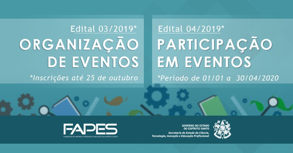 A Fundação de Amparo à Pesquisa e Inovação do Espírito Santo (Fapes) está com inscrições abertas referentes às chamadas públicas para organização de eventos e, também, para auxílio à participação em eventos técnico-científicos. Até 25 de outubro, os interessados podem submeter propostas referentes ao período de 1º de janeiro a 30 de abril de 2020.