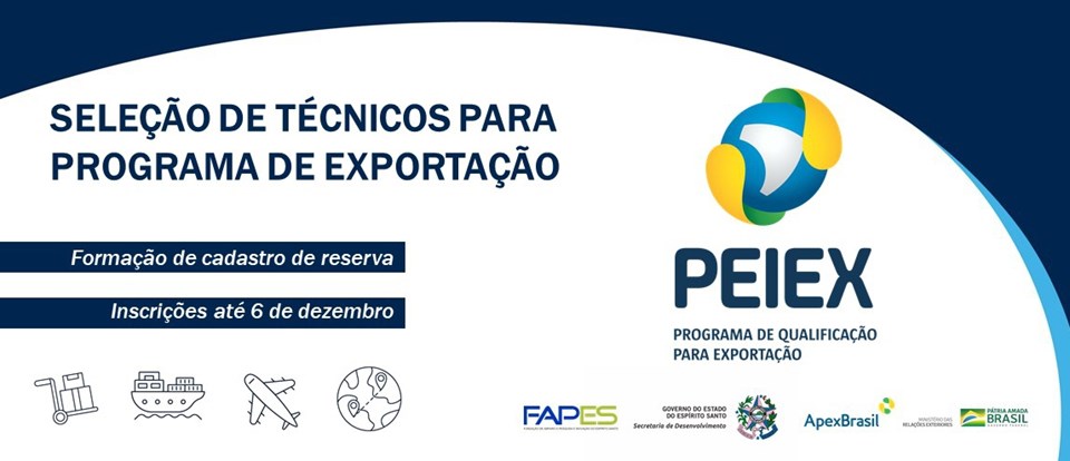 Profissionais da área de comércio exterior podem se inscrever no processo seletivo de bolsistas para atenderem a empresas do Espírito Santo por meio de assistência e consultoria. A ação faz parte do Programa de Qualificação para Exportação (PEIEX-ES), que teve edital lançado pela Fundação de Amparo à Pesquisa e Inovação (Fapes), na última sexta-feira (1º), para formação de cadastro de reserva.