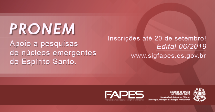 Estão abertas as inscrições para o edital do Programa de Apoio a Núcleos Emergentes (Pronem), lançado pela Fundação de Amparo à Pesquisa e Inovação do Espírito Santo (Fapes). A chamada pública é fruto da parceria com o Conselho Nacional de Desenvolvimento Científico e Tecnológico (CNPq) para destinar R$ 1,25 milhão para as pesquisas.