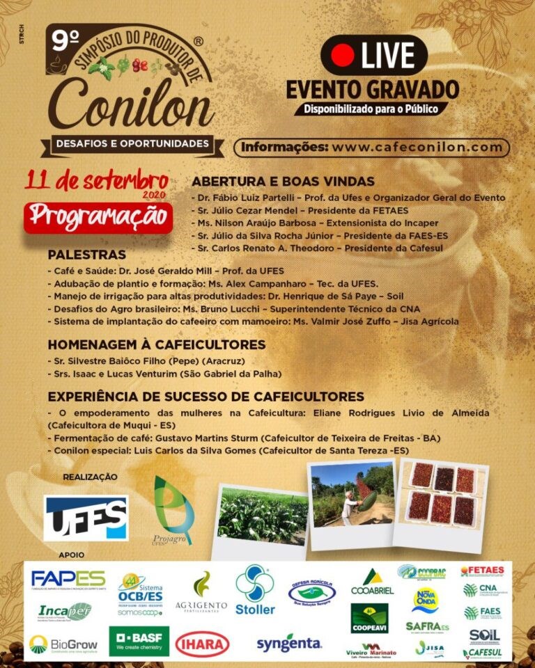 Devido à pandemia da Covid-19, causada pelo novo Coronavírus (SARS-CoV-2), o Simpósio do Produtor de Conilon de 2020 será totalmente transmitido pela internet. A nona edição do evento cafeeiro acontecerá no dia 11 de setembro e conta com apoio da Fundação de Amparo à Pesquisa e Inovação do Espírito Santo (Fapes).